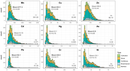 Frequency distribution of soil heavy metal concentrations (mg/kg). Vertical axis represents the frequency of samples within specific concentration intervals (i.e., the number of sampling points per histogram bin). Dashed line indicates the mean concentration. CV denotes coefficient of variation. The regional background value (shown in bottom right corner) was obtained from “Background Values of Chinese Soil Elements” [32]. Bold values and *** indicate statistically significant differences from background values (p ≤ 0.05); ns denotes non-significant differences (p > 0.05).