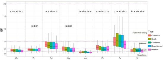 Variations in EF values of soil heavy metals across vegetation types. Different letters indicate statistically significant differences among vegetation types (p ≤ 0.05).