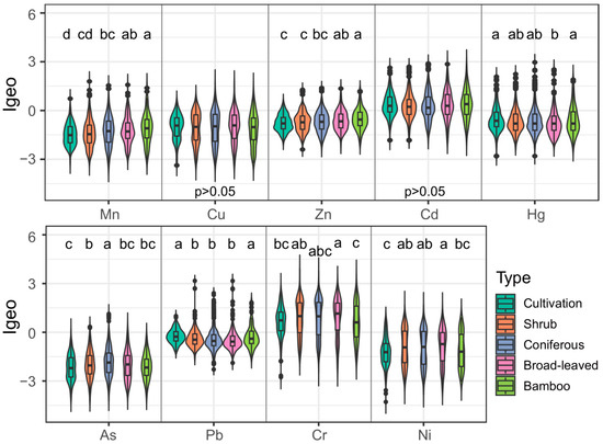 Except for Cr (0.81) and Cd (0.27), the average Igeo values of HMs were <0, with the sequence of Igeo values consistent with EF. Vegetation type significantly influenced HM Igeo values (p ≤ 0.05, Figure 4), except for Cu and Cd. The Igeo of Mn and Zn increased in the order of cultivated land < shrubland < coniferous forest < broad-leaved forest < bamboo forest, and both the Igeo of Hg and Pb were highest in cultivated land and bamboo forest. However, the Igeo of As was highest in the coniferous forest, while Cr and Ni were highest in the broad-leaved forest.