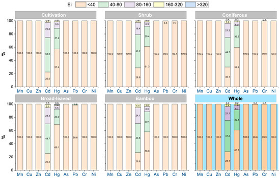 Distribution of Ei values of soil heavy metals in the study area. Data in the figure show the proportion of Ei values at different levels (%).