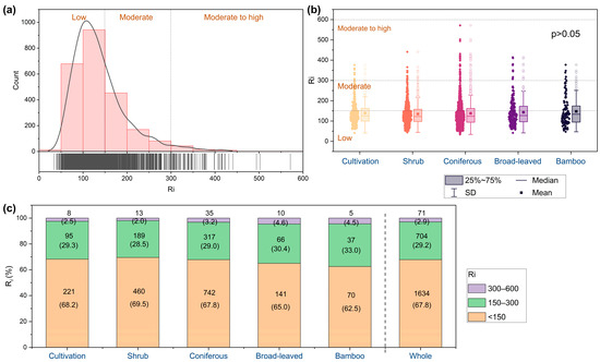 The RI values were mostly <150 in the study area (67.8% of samples), with only 2.9% exceeding 300 (Figure 6a). No significant differences were observed in RI across vegetation types (p > 0.05, Figure 6b). The proportion of samples in high-risk areas decreased as broad-leaved forest (4.6%) > bamboo forest (4.5%) > coniferous forest (3.2%) > cultivated land (2.5%) > shrubland (2.0%). In contrast, the proportion of low-risk areas was highest in shrubland (69.5%), followed by cultivated land (68.2%), coniferous forest (67.8%), broad-leaved forest (65.0%), and bamboo forest (62.5%) (Figure 6c).