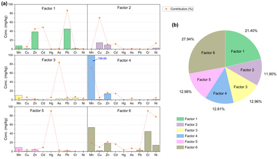 Based on the PMF model, a total of six comprehensive factors were identified as the sources of metal pollution (Figure 7). Factors 6, 1, 5, and 3 together accounted for 75.28% of the total source, with their respective contributions of 27.94%, 21.40%, 12.98%, and 12.96%. The main contributors for each factor were: Pb (86.40%), Cu (70.21%), As (83.68%), Mn (71.18%), and Hg (90.68%) for factors 1–5, respectively, while Cr (90.78%) and Ni (77.71%) contributed more to factor 6.