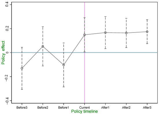 If there is a significant difference in the trend of LGUE changes between pilot and non-pilot areas before policy intervention, we cannot determine whether the observed policy treatment effect is actually caused by the policy or simply due to the different trends of LGUE changes in pilot and non-pilot areas themselves. The parallel trend assumption can ensure that LGUE in pilot and non-pilot areas have the same time trend before policy intervention, thereby ensuring the true effect of the policy. We conduct a parallel trend test using the event study method [44], and the results are shown in Figure 1. The coefficient values before the policy shock are in a fluctuating state, and there is no significant pre trend. However, after the policy shock, there is a clear upward trend in the urban LGUE, indicating that the policy shock had a significant effect. Therefore, the DID model set in this paper satisfies the parallel trend test.