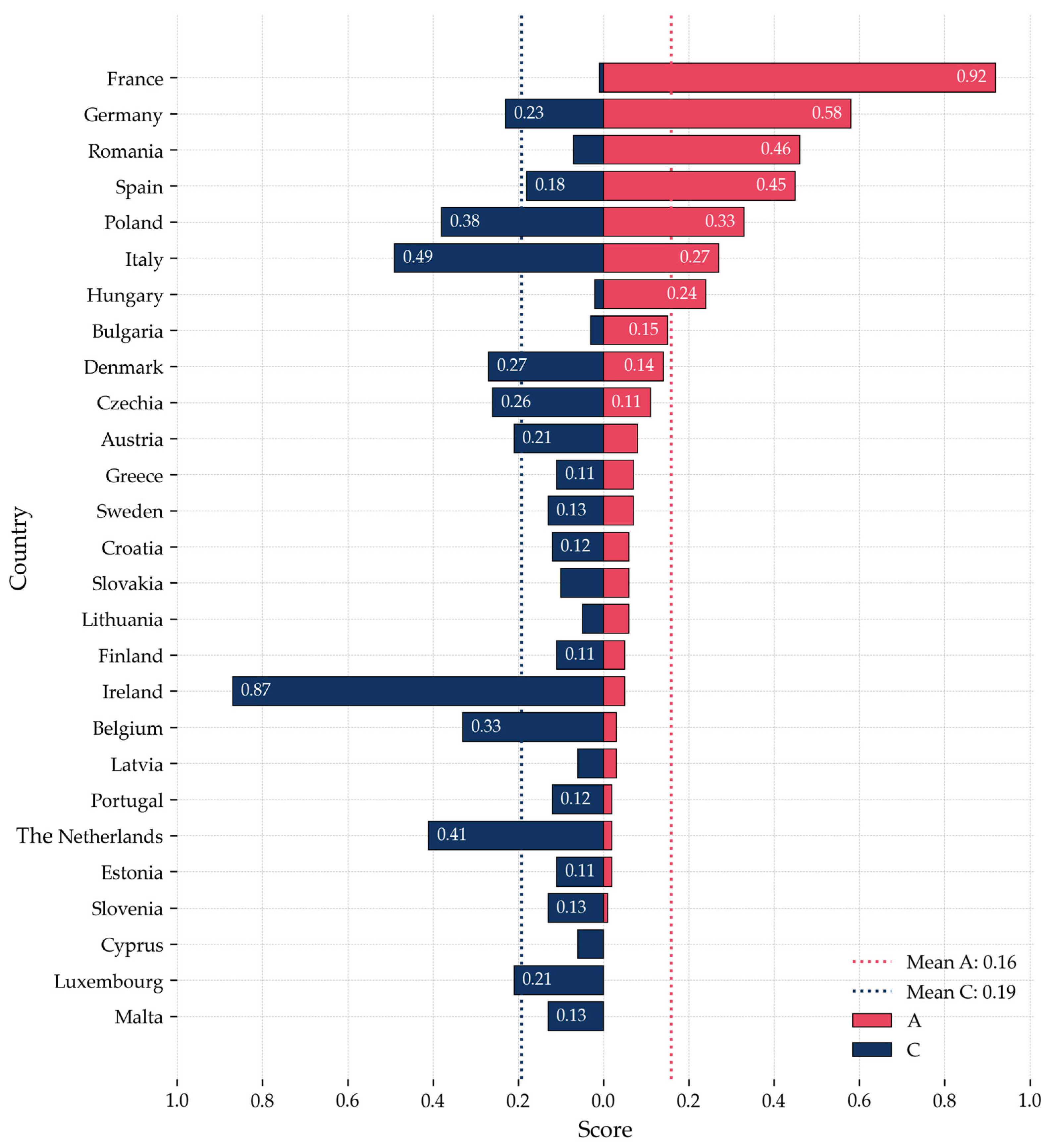 Figure 2 presents a general competitiveness overview of the EU cereal sector in an aggregated manner. The averaged scores are displayed per country and category. The overall mean is depicted by the red dashed line: 1.61, with nearly half of the EU-27 member states surpassing this threshold. Values above the mean indicate stronger competitiveness based on countries’ performance across the categories (A–E) that shape competitiveness, while values below the red dashed line reflect deficiencies. The observed disparities highlight systemic asymmetries within the EU, suggesting that competitiveness is driven more by fragmented strengths than by a cohesive, well-aligned framework.