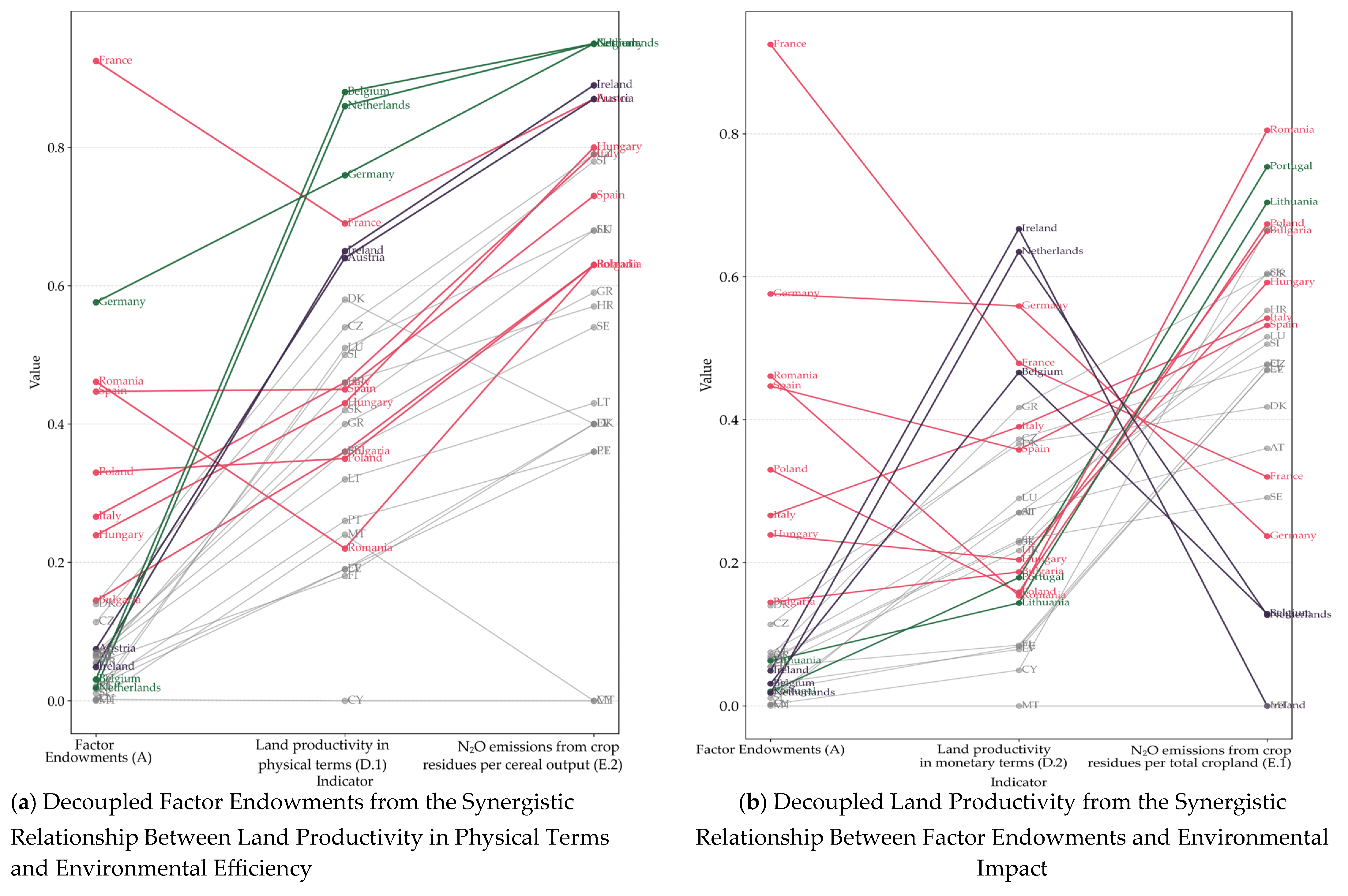 Based on the competitiveness framework employed in this research, France emerged as the most competitive country in the EU, achieving the highest overall score, primarily driven by factor endowments (0.92) and a high level of self-sufficiency (0.84), yet with strategic trade representing its main weakness (0.01) within its cereal value chain. Germany benefits from consistent performance across all five competitiveness categories, suggesting a symmetrical alignment of influence factors. Conversely, countries like Ireland (0.77) and Italy (0.49) manifested different forms of competitiveness, which was heavily reliant on trade strategy despite limited raw agricultural endowments (0.05 and 0.27), indicating asymmetry between influence factors, a model dependent on external markets. An opposite pattern was observed in the case of Romania, Hungary, and Bulgaria, whose competitiveness is driven by raw agricultural endowments (0.46, 0.24, and 0,15) and self-sufficiency (0.63, 0.65, and 0.77), but hindered by myopic trade strategies (0.07, 0.02, and 0.03), revealing systemic asymmetries. This configuration translates into untapped agricultural potential and value chain deficiencies. The decoupling of cereal production capacity from strategic trade suggests structural issues in Eastern Europe countries. Poland, a notable exception from the same region, broke the competitiveness patterns of Romania, Hungary, and Bulgaria by better aligning its strategic trade patterns (0.38) with its cereal endowments (0.33), self-sufficiency (0.57), and environmental impact (0.54), although productivity can still be improved (0.25). Such performance positions Poland closer to Germany’s systemic alignment, rather than to its Eastern European counterparts.