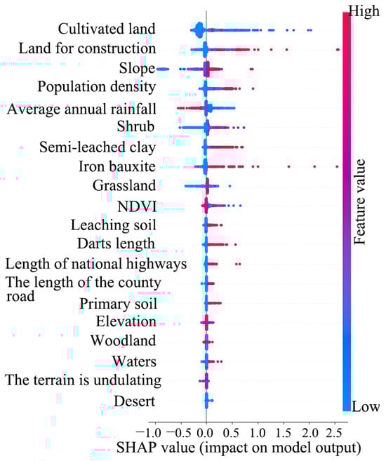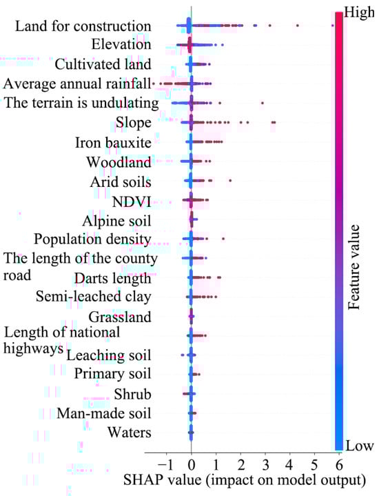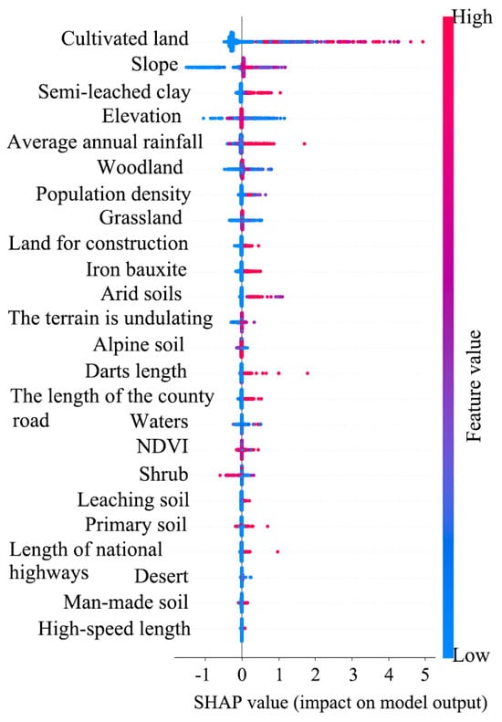 SHAP visualization of the contribution of each influencing factor to landslide risk prediction.