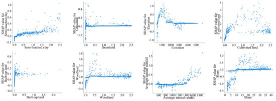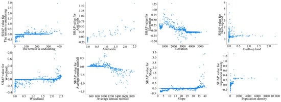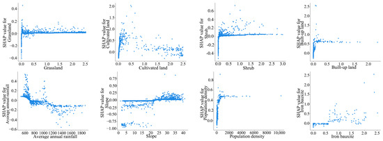 Table 2 shows the RMSE and R2 values of the training and test sets in the model. In addition, the difference between RMSE and R2 between the training set and the test set is small, which indicates that the evaluation accuracy and generalization ability of the model are high. Subsequently, the results of the LightGBM model were visualized in combination with the SHAP method, aiming to explain the specific contribution of each influencing factor in the landslide risk prediction (Figure 3). In the prediction of complex geological hazards such as landslide risk assessment, there is usually a nonlinear relationship between the characteristics and the prediction results. For example, characteristics such as slope and precipitation may not affect landslide risk in a simple linear way, but after a certain threshold, the risk changes more drastically, as shown in Figure 4, which shows the nonlinear graph of the most important indicators.