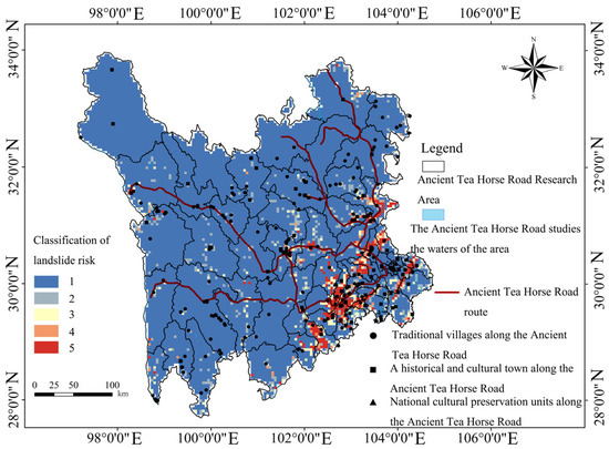 There is a significant spatial indifference in the landslide risk faced by cultural heritage sites along the Ancient Tea Horse Road in Sichuan, especially in very high-risk and high-risk areas. The area of the extremely high-risk landslide area is about 7825 km2, accounting for 2.80% of the total area of the study area. The number of landslide hazards in these areas is dense, especially in the extremely high-risk areas, accounting for 58.86% of the total number of landslide points. Despite the small size of the very high-risk area, due to the complex geographical and geological conditions, landslides occur frequently and disasters are severe, which poses great challenges to the protection of cultural heritage.