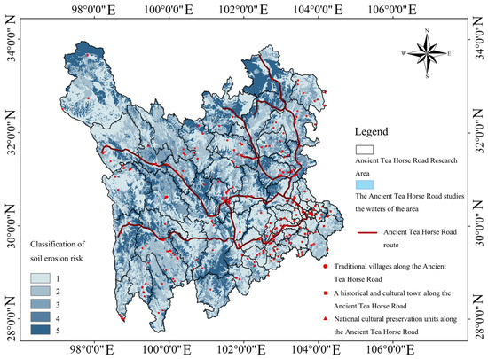 The distribution of soil erosion along the Ancient Tea Horse Road in Sichuan shows obvious regional differences, and the distribution of soil erosion is closely related to natural factors, climatic conditions and human activities. According to the data analysis in Table 7, the micro-erosion zone accounts for 43.59% of the total area, and the number of cultural heritage sites is the largest, accounting for 53.45% of the total. Although the level of soil erosion in the region is relatively low, the high density of cultural heritage puts greater pressure on the conservation of these areas. This area is mainly distributed in Chengdu, Ya’an and other places.