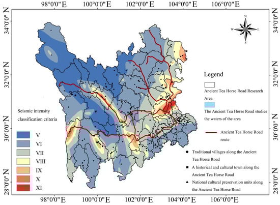 According to the GB18306-2015 standard, this study evaluated the seismic situation in the study area. The seismic intensity distribution data used are from the Resource and Environmental Science and Data Center of the Chinese Academy of Sciences and were spatially tailored to the boundaries of the study area to ensure data consistency. The seismic intensity of the study area was divided into seven grades according to the intensity: V (obvious tremor), VI (strong tremor), VII (severe), VIII (severe), IX (extremely strong), X (catastrophic), and XI (extremely catastrophic) (Figure 14).