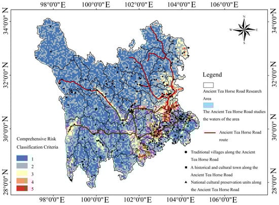 The risk classification of the study area showed that the very low risk area and the low risk area occupied most of the area, which were 145,963 km2 (52.23%) and 106,775 km2 (38.21%), respectively (Table 10), indicating that most of the study area in the Ancient Tea Horse Road Cultural Heritage Area was at low risk. However, most of the cultural heritage sites are located in areas of medium risk and above, accounting for 52.36% of the total, indicating that more than half of the cultural heritage is at high risk, facing greater threats of natural disasters and anthropogenic changes, indicating a need to strengthen categorical protection measures (Figure 15).