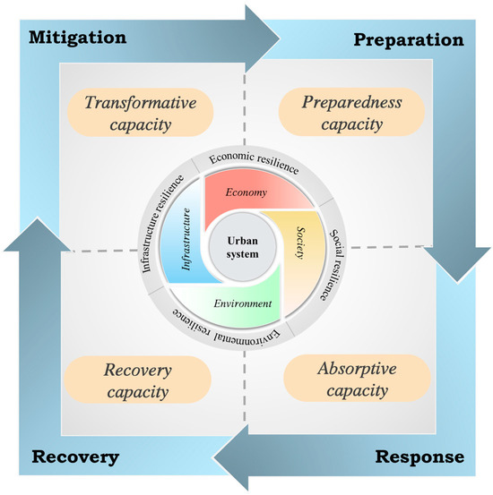 Drawing upon the classic theory of complex systems and previous research, this study partitions the urban system into four subsystems—economic, social, infrastructural, and ecological—from an urban systems perspective [55,56,57,58]. Based on the foregoing analysis, each urban subsystem is conceptualized as a disaster-bearing entity that mitigates hazards through its specific functional capacities; in other words, urban resilience is fundamentally achieved through the operational functions of the urban system. Moreover, when considering the entire process of disaster management, the urban system exhibits varying levels of resilience at different stages, which serve as indicators of overall urban resilience. Accordingly, the resilience capacity manifested by the urban system at each stage of disaster management has been defined as follows: