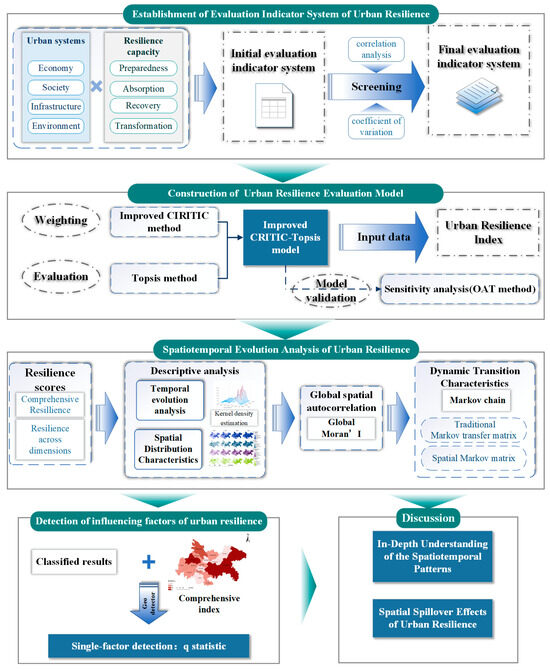 To investigate the spatiotemporal evolution mechanisms and driving factors of urban resilience in the Chengdu–Chongqing urban agglomeration, an ultimate urban resilience evaluation indicator system was first established. Subsequently, an urban resilience evaluation model was established. The improved CRITIC-TOPSIS method was developed by enhancing the fluctuation and conflict indicators in the CRITIC method through the use of the standard deviation system and absolute values, respectively, thereby enabling more accurate weight calculations. The TOPSIS method was employed to measure the resilience indices of various cities over different years. Sensitivity analysis was conducted to validate the stability of the evaluation model. GIS spatial analysis was then utilized to explore the specific changes in the spatiotemporal pattern of resilience, and a Markov chain was applied to conduct an in-depth analysis of dynamic transition trends. Furthermore, a geographic detector model was used to analyze the driving factors behind the evolution of the spatial pattern of urban resilience in the Chengdu–Chongqing region. The overall research framework is illustrated in Figure 3.