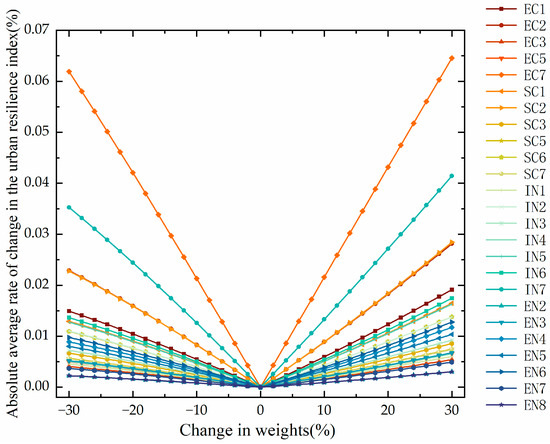 The CRITIC-TOPSIS model employed in this study is a multi-criteria decision-making model that involves significant uncertainty. Although improvements to the CRITIC method have enhanced the accuracy of indicator weight calculations to some extent, they may also introduce bias in certain indicators due to intrinsic data factors. Therefore, sensitivity analysis is required to validate and verify the urban resilience evaluation results. In this study, the One-at-a-Time (OAT) method [120] was employed for sensitivity analysis, wherein the absolute mean variation rate of urban resilience was calculated under weight changes to assess the stability and reliability of the evaluation model (see Supplementary Material S3 for details on the OAT method).