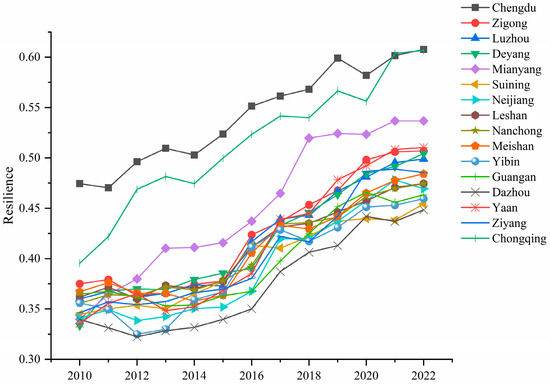 A time-series plot of resilience levels for each city was generated (Figure 5). The findings reveal a general upward trend in the resilience indices over the study period. Chengdu and Chongqing consistently demonstrated significantly higher resilience indices than other cities, maintaining their leading positions. Cities such as Deyang and Mianyang showed mid-level resilience, with a noticeable increase, from approximately 0.34 in 2010 to around 0.5 in 2022. Most of the other cities displayed relatively low resilience levels and similar growth rates, remaining in the lower range of resilience indices.