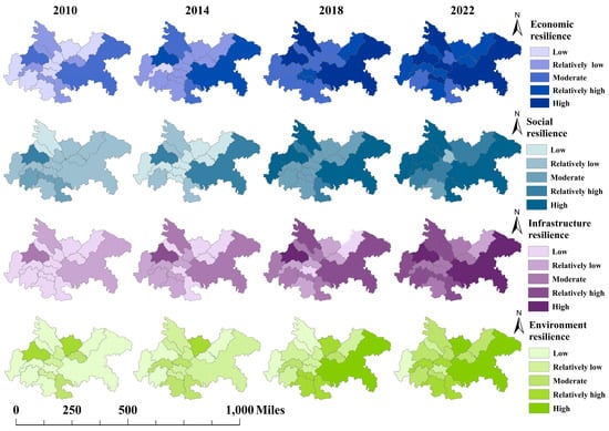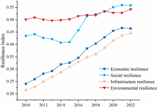 The urban resilience was categorized into four subsystems from the perspective of urban systems, and resilience indices for these subsystems were calculated from 2010 to 2022. As shown in Figure 6, economic and infrastructure resilience exhibited steady growth. Social resilience experienced a significant increase after 2016, gradually diverging from the other dimensions. Environmental resilience remained relatively stable. Comprehensive resilience showed a consistent upward trend driven by concurrent improvement in all dimensions.