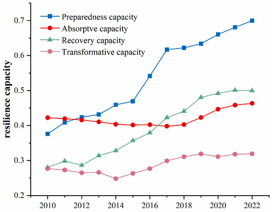 Preparedness capacity exhibited the most rapid improvement, driven by advances in infrastructure, expanded healthcare coverage, and stronger economic tolerance. Although ranking second overall, absorptive capacity showed relatively modest growth, increasing slowly from approximately 0.4 in 2010 to around 0.5 in 2022. Recovery capacity demonstrated a consistent upward trajectory, with accelerated growth particularly evident after 2014. Among the four dimensions, transformative capacity remained the lowest and slowest to develop.