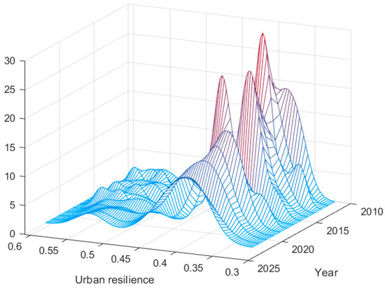 The kernel density estimation (KDE) method was used to analyze the distribution pattern of urban resilience in the Chengdu–Chongqing urban agglomeration from 2010 to 2022. The Gaussian kernel function, known for its high accuracy, was applied for the estimation [121,122]. (See Supplementary Material S4 for the detailed formula).