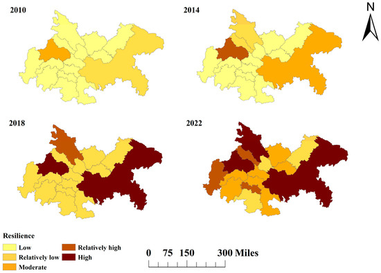 Based on the comprehensive resilience index and the resilience indices of each dimension for each city (Supplementary Material S9), spatial distribution maps of resilience were generated using ArcGIS 10.8 software (Figure 9, Figure 10, Figure 11 and Figure 12).