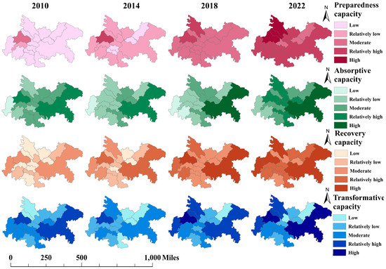 From the perspective of resilience capacity, the urban resilience was divided into four dimensions, and the resilience indices for these dimensions were calculated for the years 2010 to 2022. Figure 7 illustrates the significant spatiotemporal evolution characteristics of the four dimensions of resilience capacity in the Chengdu–Chongqing urban agglomeration. These findings highlight the phased achievements of regional resilience-building efforts as well as existing development gaps.