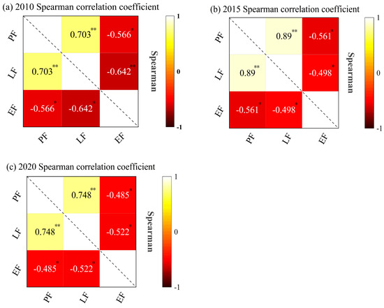 When using SPSS SPSS Statistics V26 for data analysis, Spearman’s rank correlation analysis becomes a powerful tool for evaluating the quantitative relationships between land use functions. This method quantifies the strength of monotonic relationships between variables by calculating the ρ value, which ranges from −1 to 1. When the ρ value is extremely positive (i.e., close to 1), it reveals a strong positive synergy between the two land use functions. Conversely, when the ρ value is extremely negative (i.e., close to −1), it indicates a clear negative trade-off relationship. Additionally, the consideration of the significance level of PPP helps to validate the statistical reliability of these relationships.