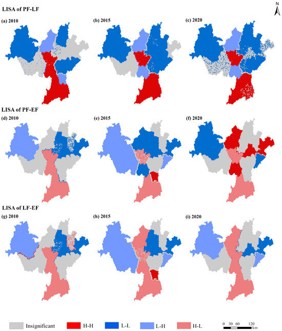 43]. The resulting LISA (Local Indicators of Spatial Association) distribution map visually and effectively reveals the spatial interaction characteristics and patterns between adjacent functions within the region, thereby deepening the understanding of the dynamic relationships among the PLES. It also provides theoretical support for the subsequent functional area division.