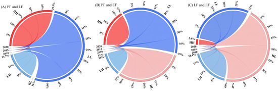 During the study period, the relationship between PF and LF in Liangshan Prefecture has gradually shifted from a trade-off to a synergistic one, but it is still dominated by a trade-off relationship; the conflict between LF and EF has intensified, especially as the pressure on the environment has increased in the areas of high-value LF. Moreover, the proportion of coordination between LF and EF has declined in the areas of low value, which needs to be targeted to the optimization of the region. The strong synergistic effect of PF and LF highlights the role of economic growth in the improvement of people’s livelihoods. The strong synergy between PF and LF highlights the role of economic growth in improving people’s livelihoods, but the significant trade-off between the two and EF exposes the environmental costs of the traditional development model. It is worth noting that the trade-off between PF and EF is particularly prominent in the southern industrial agglomeration, and although ecological compensation policies partially alleviate the conflict. The expansion of high-value synergistic zones (HH) still relies on green technological innovations and industrial transformations. The northeastern concentration and dynamic volatility of the LF and EF trade-offs suggest that there is a deep-seated conflict between the livelihood needs of the regions with lagging infrastructures and ecological protection, which needs to be precisely regulated through differentiated policies. Policies need to be differentiated to achieve precise regulation.