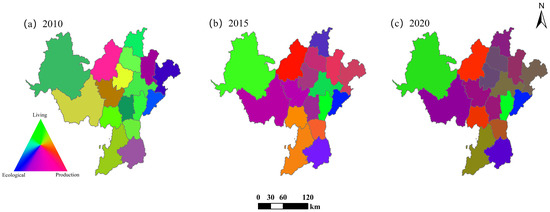 Maxwell’s triangle offers a visual representation of the interaction between three variables through the RGB color model, presenting the data in spatial graphics. In this study, the triangle is used to depict the combined contributions of the three primary land functions, with PF, LF, and EF represented by red, green, and blue, respectively. This allows for the determination of the chromaticity coordinates for each evaluation unit
