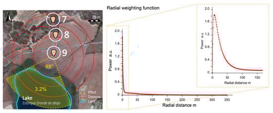 The SWC data were bounded by a porosity estimation of approximately 0.55, based on the dry bulk density and assumed particle density = 2.65 g/cm3 (i.e., porosity = 1 bulk density/particle density). Values exceeding porosity should be bounded, as they are likely influenced by ponded water, neutron count variations, or parameter uncertainty. The effect of the small lake located at the end of the hillslope, approximately 100 m away, was rather minimal (3.2% contribution to neutron moderation for the closest site, S9) (Figure 2). To quantify this influence, the Wr function was integrated over the radio and the angle of the patch, as proposed by Schrön et al. [28]. This integration, illustrated in Figure 2, confirms that the influence of the lake is within the error range of our data and shows the decrease in sensitivity with the increase in the distance from the sensor. It is important to note that Wr accounts for reflected neutrons (i.e., neutrons with soil contact), while the sensor also detects 20–40% of direct/incoming neutrons. As a result, the actual signal drop due to the lake is even lower, at around 2%, leading to the application of a correction factor (C = 1.02). This correction was applied to neutron counts before soil water content (SWC) estimation, using the equation Ncorr = C × N. The presence of the lake within the sensor footprint moderates neutron intensity, and this correction ensures that SWC values remain accurate despite the lake’s small but measurable influence.