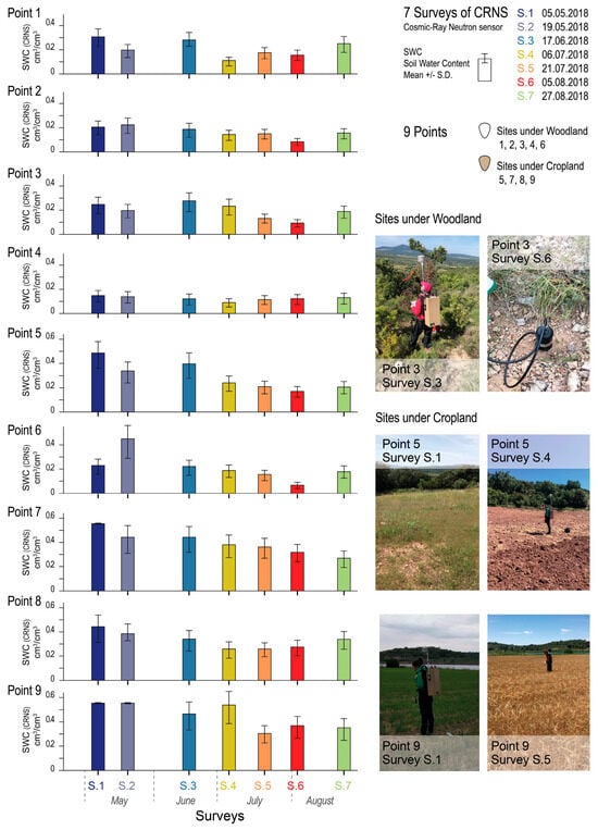 The higher variability in SWC found during wet surveys confirms the important effect of land use/land cover (LULC) on soil water content, which in our study is conditioned by the different parental material, soil depth, and soil properties under woodlands and croplands. Deeper soils store more water that likely affects the variability in the wet period, while for drier conditions, the differences between woodlands and croplands sites are attenuated. The shallower woodland soils (Leptosols) (points 1, 2, and 3) have a more homogeneous soil depth in comparison to the deeper and more variable depth profiles of the cropland soils. This circumstance would lead to a larger variation in water content in variable deeper cropland soils, while for dry conditions, such differences would be attenuated. Another factor worth considering is the soil water dynamics registered by CRNSs in woodlands that might correspond more to the upper 5–10 cm, including the litter layer, whose wetting–drying dynamics are significantly faster than those of deeper soil layers [11].
