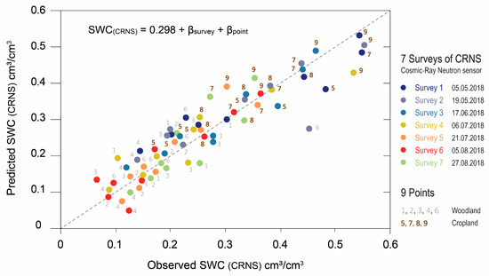 Scatterplot graphs of the observed (ordinate axis) versus predicted (abscissa axis) SWC(CRNS) by the generalized linear model (GLM, 2 factors: survey date and point location). Black dotted line denotes the regression 1:1 (intercept = 0, slope = 1).