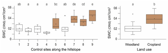 The control points had different land uses, which were closely related to the substrate and soil characteristics of the sites and controlled the variations in SWC. Therefore, the spatial variability in SWC between each site was examined in relation to land use. The SWC varied largely within the close distances of the sites (Figure 5). A higher variability in SWC for the seven surveys was recorded in cropland sites, while woodland sites varied less. The SWC means were significantly different between cropland sites, while apart from site 1, no significant differences were found within woodland sites. The mean value of SWC for woodland sites was significantly lower than in croplands.