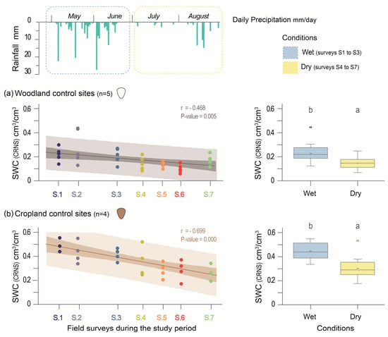Variation in SWC(CRNS) during the 7 surveys, linear regression trendline for woodland and cropland, and box and whisker plots of SWC(CRNS) between wet and dry conditions. Different letters indicate significant differences at the 95% confidence level.
