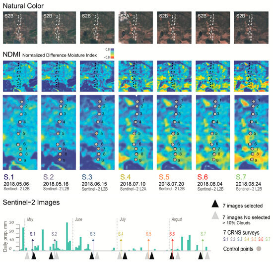 The satellite surface moisture product from Sentinel-2 was analyzed based on the spatial and temporal variations in the NDMI index (Figure 7). The Normalized Difference Moisture index was monitored during the study period, providing information for each of the seven surveys. The NDMI maps displayed many similarities to the SWC pattern estimated with CRNSs during the surveys. From survey S1 to S7, the NDMI index decreased, showing higher values during the wet period (S1 to S3) and lower ones during the dry period (S4 to S7). The relationships explored between NDMI index and the SWC estimated by CRNSs showed a low but significant correlation (r = 0.352). The results improve when distinguishing between dry and wet conditions, obtaining higher correlations between CRNS and NDMI (r = 0.485).