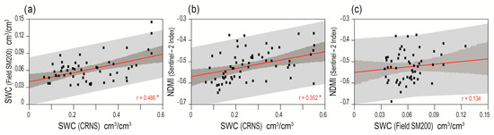 Scatter plot and linear regression trendline: (a) SWC(CRNS) versus SWC (Field SM-200), (b) SWC(CRNS) versus NDMI (Sentinel-2 Index), and (c) SWC (Field SM-200) versus NDMI (Sentinel-2 Index). * indicates that the correlation is statistically significant at the 95% confidence level.