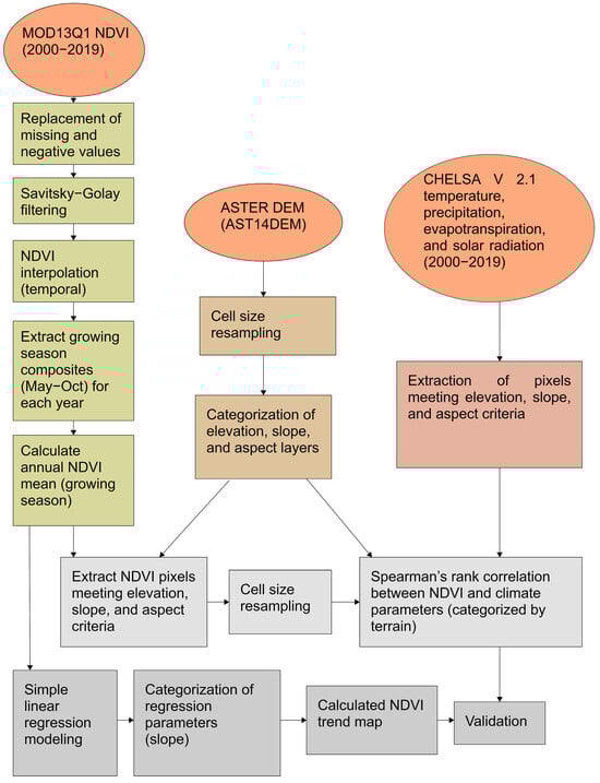 Step-by-step methodological workflow for data acquisition, pre-processing, and integration of remote sensing data. The dark orange oval-shaped box represents the data source, the green, olive, and light orange-colored rectangular boxes indicate image processing and data extraction, and the gray rectangular boxes represent data integration and result analysis.