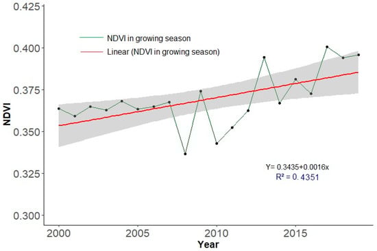 Normalized difference vegetation index (NDVI) trends during the growing season from 2000 to 2019.