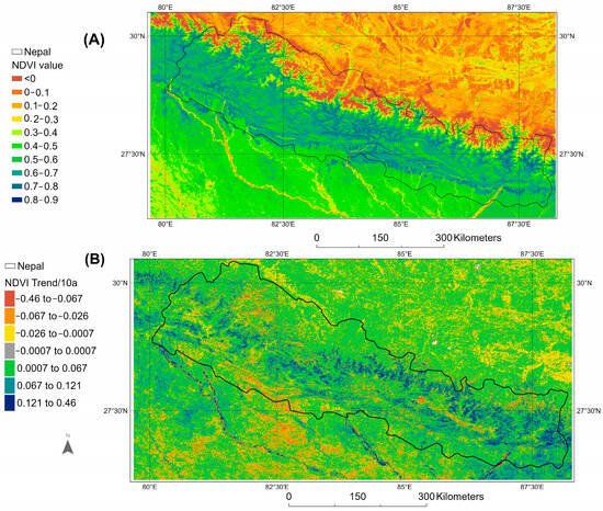 (A) Spatial distribution of the mean annual growing season NDVI and (B) spatial distribution of the trends of NDVI change within each grid for the years 2000–2019.