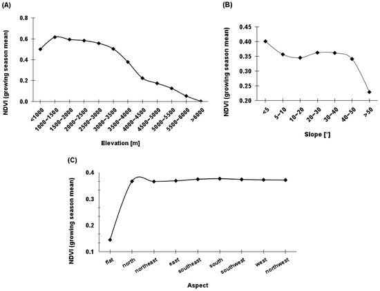 NDVI (growing season mean) variations with (A) elevation, (B) slope, and (C) aspect.