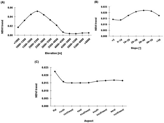 Variations in NDVI trends with (A) elevation, (B) slope, and (C) aspect.
