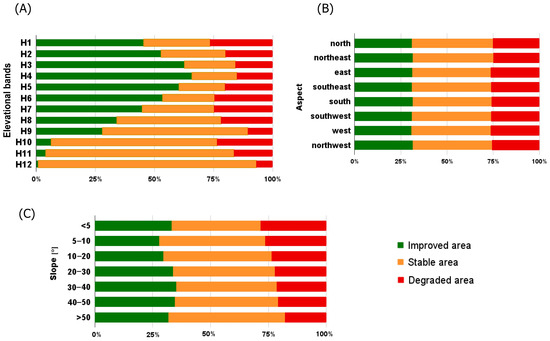 Vegetation cover changes (% of total area) from 2000 to 2019 at different (A) elevations, (B) aspects, and (C) slopes.