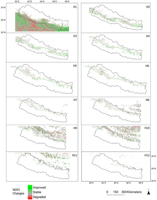 - Shrestha, B.; Zhang, L.; Shrestha, S.; Maharjan, L.; Khadka, N.; Dahal, P. Spatiotemporal Patterns, Sustainability, and Primary Drivers of NDVI-Derived Vegetation Dynamics (2003–2022) in Nepal. Environ. Monit. Assess. 2024, 196, 607. [Google Scholar] [CrossRef] [PubMed]