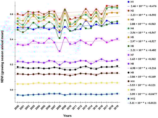 Changes in vegetation greenness over two decades (from 2000 to 2019) at different elevational ranges: H1 (below 1000 m), H2 (1000–1500 m), H3 (1500–2000 m), H4 (2000–2500 m), H5 (2500–3000 m), H6 (3000–3500), H7 (3500–4000 m), H8 (4000–4500 m), H9 (4500–5000 m), H10 (5000–5500 m), H11 (5500–6000 m), and H12 (above 6000 m).
