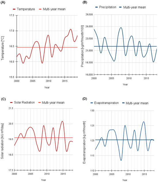 Climate data (i.e., temperature, precipitation, evapotranspiration, and solar radiation) were obtained from CHELSA V2.1 (Climatologies at High resolution for the Earth Land Surface Areas) for the same study period. The used monthly time-series of tas (mean daily air temperature), pr (precipitation amount), pet (potential evapotranspiration), and rsds (surface downwelling shortwave flux in air) data are available at https://www.doi.org/10.16904/envidat.228 (accessed on 20 February 2021) [71]. It gives downscale model output for climate parameter estimates. The resolution of the CHELSA data is 30 arc seconds.