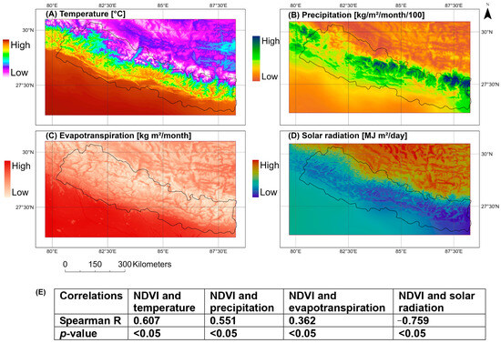 In general, vegetation greenness and temperature are positively correlated. However, this connection is altered by the interaction with topography, similar to the NDVI’s association with precipitation and evapotranspiration. Areas characterized by lower radiation (Figure 12D) exhibited enhanced vegetation greenness, largely observed in the western part of Nepal (Figure 7C). This finding supports the negative correlation between the NDVI and radiation in the mentioned areas (Figure 12D). The variations in the mean NDVI over the two decades (Figure 3) were associated with the fluctuation in the climate parameters (Figure 11).
