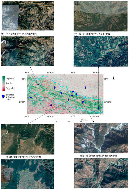 Shrestha et al. [46] aimed to delineate the relative contributions of climatic and non-climatic factors to vegetation dynamics in Nepal. Their study revealed an overall increase in the NDVI at a rate of 0.0013 per year throughout the study period, with a large portion of the vegetation cover exhibiting a positive greening trend [46]. They reported that vegetation dynamics in higher elevations are predominantly driven by temperature fluctuations [46], while lower elevations are more influenced by precipitation and human interventions, such as agricultural expansion [46]. These findings suggest that observed trends in vegetation improvement and degradation are largely attributable to human activities, in line with previous studies on land use change in the region [6,102]. Moreover, distinguishing the effects of climatic influences from human impacts on vegetation dynamics over the past centuries presents a complex challenge [103].