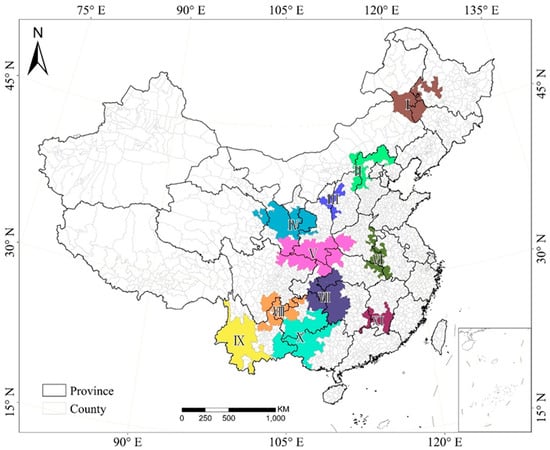 CDAs are contiguous destitute areas with special difficulties and the gathering areas of the poor population in China. To improve the targeting of poverty alleviation policies and the effective use of poverty alleviation resources, The State Council has designated 14 contiguous areas with special difficulties [], including 11 areas: Southern foothills of the Great Khingan mountains (I), Yanshan Mountain-Taihang Mountains (II), Lvliang Mountains (III), Liupan Mountains (IV), Qinba mountains (V), Dabie Mountains(VI), Wuling Mountains (VII), Wumeng Mountains (VIII), Western Yunnan Border Area (IX), Yunnan-Guizhou-Guangxi Rocky Desertification Area (X), Luoxiao Mountains (XI). In this study, we mainly concentrate on the 11 CDAs including 105 cities and 532 counties (Figure 1).