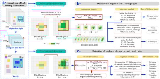 The NTL data set and CDAs’ boundaries were used to extract all pixel DN in the CDAs from 2000 to 2020, set detection rules, compare the changes in the intensity and number of regional DN on a time scale, and, finally, classify counties (Figure 2a). This change detection was mainly carried out from two aspects. The first is object-oriented detection of regional NTL change (Figure 2b). The second is pixel-scale oriented (Figure 2c), quantizing its intensity and rate of change. Therefore, the spatial heterogeneity of NTL changes can be more accurately reflected.