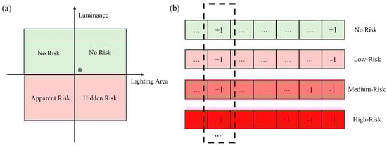 Through the above multi-period continuous threshold judgement method, we objectively classify counties as expanding, shrinking or stable. To further assess their risk of returning to poverty, we adopt a dual-tiered risk assessment framework from overall characteristics. Firstly, we use the NTL expansion area and luminance of each county during the study period to make judgements on the overall development pattern, and categorize them according to four patterns (Figure 3a): I. Both area and luminance are growing: this type has good economic development, and there is no risk of returning to poverty; II. The area is shrinking but luminance is increasing: this type is in the stage of smart growth, and there is no risk of returning to poverty; III. The area and luminance are showing a decreasing trend: this type shows obvious characteristics of economic decline, belonging to the apparent poverty return risk; IV. Area expansion but luminance decline: this type shows that economic development depends on area expansion, belonging to the hidden poverty return risk. By judging the risk patterns of the counties in the study area, we further use the time-series data of poverty assessment to classify the risk of returning to poverty. A county is considered to be of the type with a risk of returning to poverty if it appears to have a shrinkage mark (−1) after being marked as expanding in one period (+1) and fails to recover the expansion mark (+1) by the last period. In this case, we use the number of times a county has been marked with a shrinkage mark to classify the risk level, i.e., the more shrinkage, the higher the risk of returning to poverty.