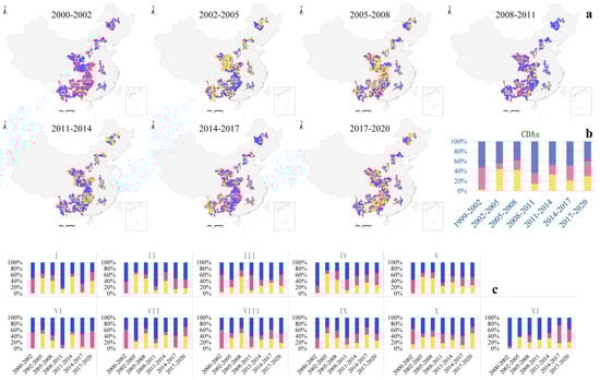 Using a 4-year detection cycle, we identified the spatial development types of different counties in CDAs during 2000–2002, 2002–2005, 2005–2008, 2008–2011, 2011–2014, 2014–2017, and 2017–2020 (Figure 5a). The number of expanding counties in different periods changed greatly. The number of expansions was 283, 236, 203, 340, 255, 259, and 214, respectively. During the period from 2008 to 2011, expansion reached its peak (Figure 5b). From the perspective of the region, from 2008 to 2011, expansion counties were mainly concentrated in V, and X, with 53, 48, and 46 expansion counties, respectively. Shrinking counties: From 2000 to 2002, only 14 counties were shrinking. During 2002–2005, the number of shrinking counties was the largest, which was 235,225 from 2005 to 2008, mainly concentrated in IV, V and X. Since then, the number of shrinking counties has been reduced to 77 from 2008 to 2011 and gradually increased to 158 from 2017 to 2020. The number of stable counties increased from 235 in 2000 to 2002, to about 100 in each stage from 2005 to 2014, and about 160 from 2014 to 2020 (Figure 5c).